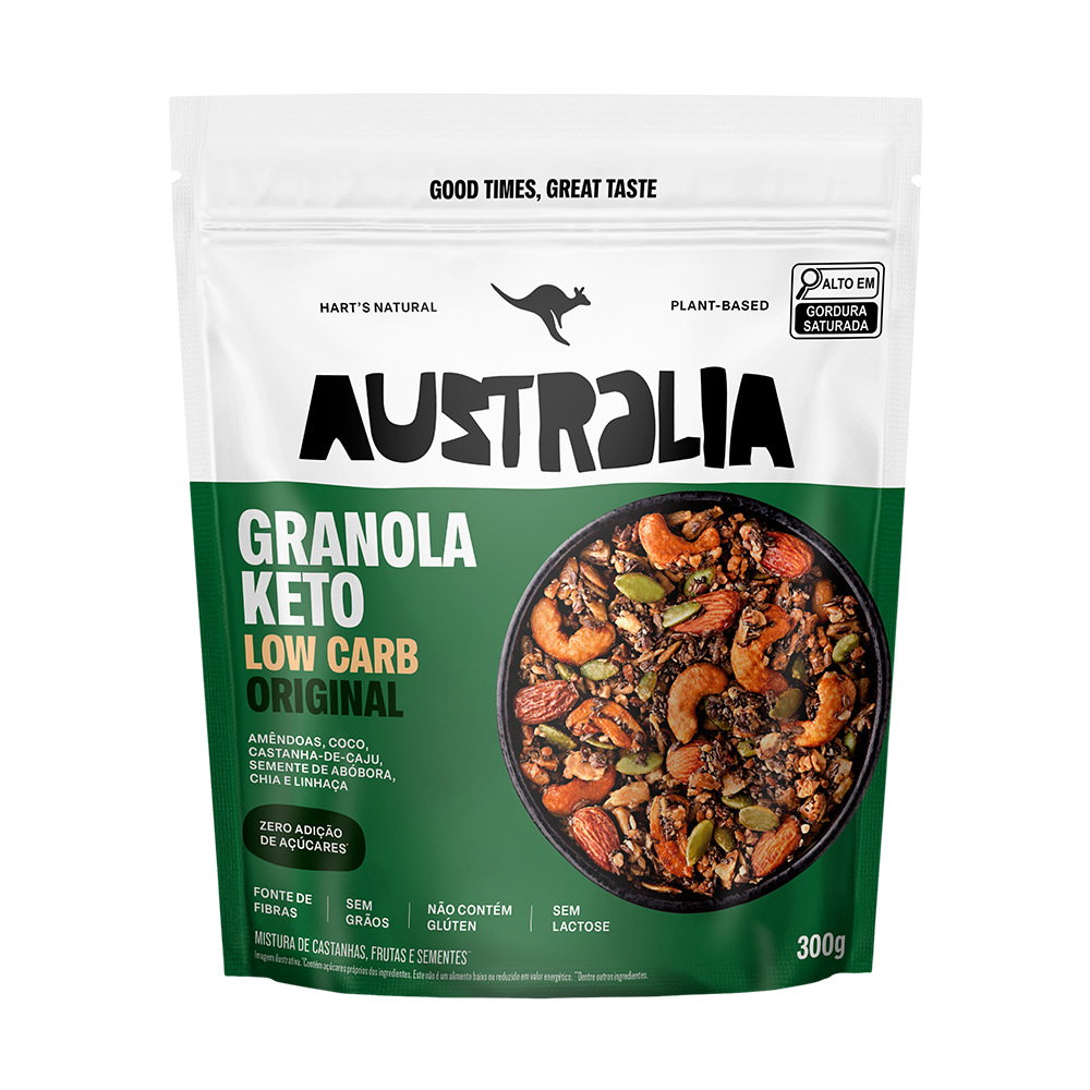 A Granola Australia Keto PROTEIN Sal Marinho Crunch é o seu novo ritual de energia. Feita com proteína 100% vegetal, sem açúcar, low carb e com uma crocância tão viciante que pode causar ataques não autorizados à sua despensa.